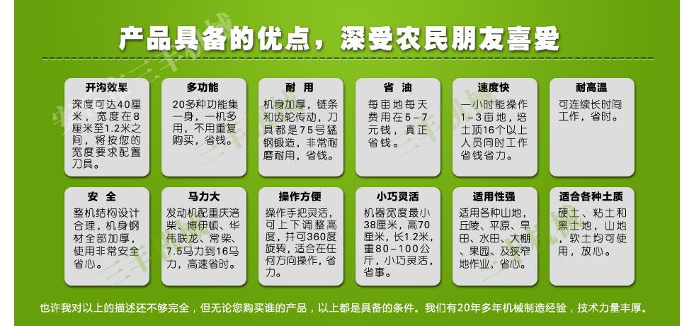 。我們的基本定位和目標(biāo),開(kāi)溝機(jī)我們走過(guò)的每一步雖然歷經(jīng)無(wú)數(shù)艱辛。我公司牢固樹(shù)立質(zhì)量為本,信譽(yù)至上,用戶(hù)至上的營(yíng)銷(xiāo)宗旨.走品牌經(jīng)營(yíng)戰(zhàn)略和產(chǎn)品精品戰(zhàn)略。我公司很大程度上調(diào)動(dòng)了員工的積極性、主動(dòng)性、創(chuàng)造性,保證公司和員工穩(wěn)定的、